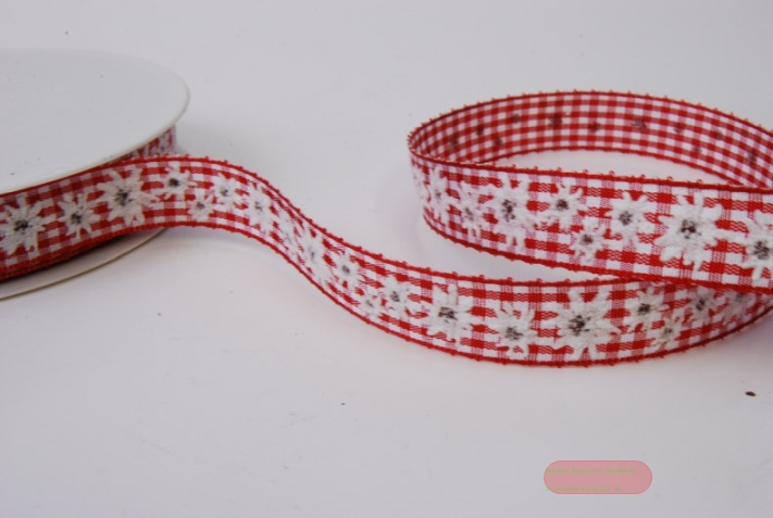 Band 20m/ 15mm, Karo Vichy mit Edelweiss, rot