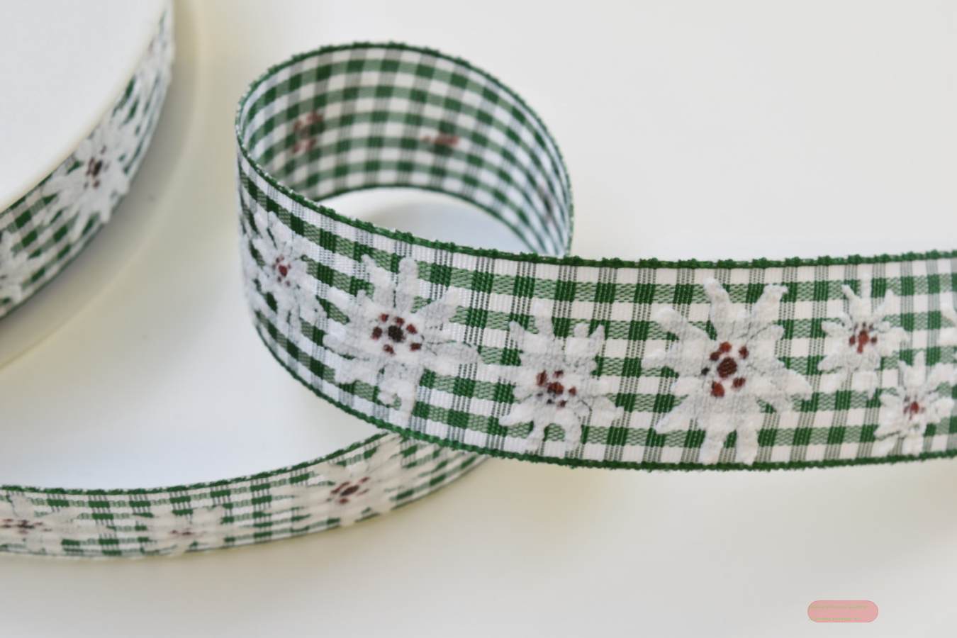 Band 20m/ 25mm, Karo Vichy mit Edelweiss, grün